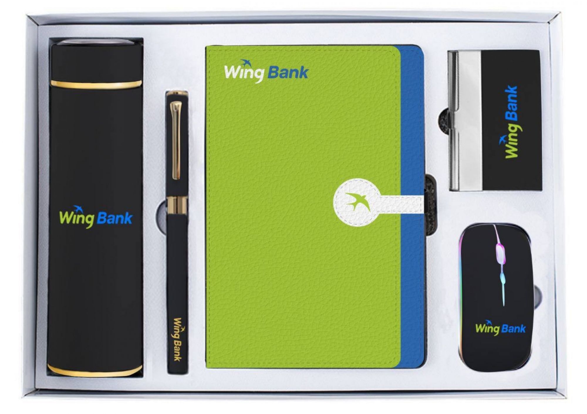 Trọn bộ quà tặng cao cấp gồm: sổ tay, viết, chuột không dây, bình giữ nhiệt, ... được thiết kế bằng chất liệu cao cấp, màu sắc các sản phẩm quà tặng được phối theo logo thương hiệu làm nổi bật lên sản phẩm. Hộp đựng quà sang và đẳng cấp