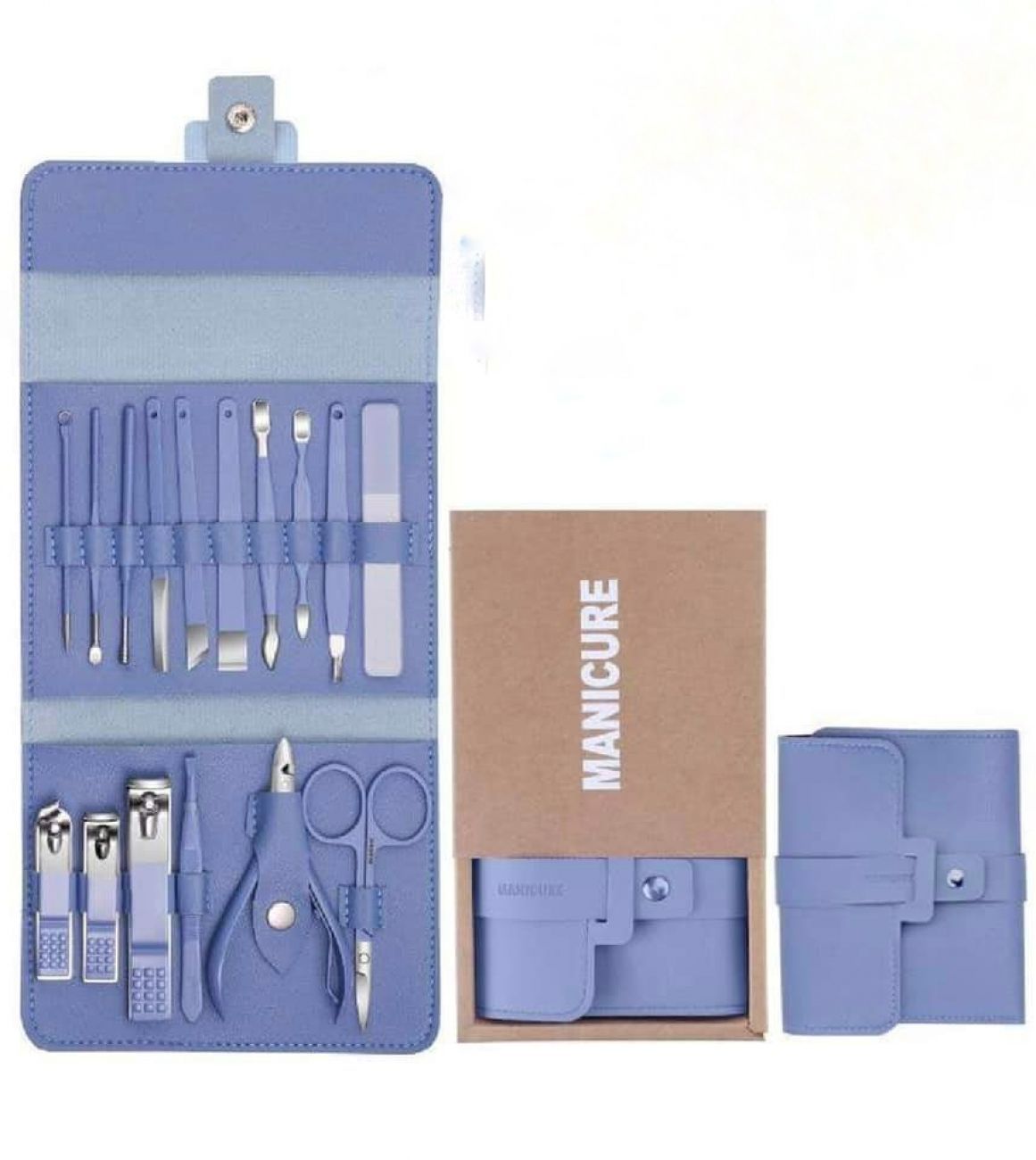 Trọn bộ gồm: Kiềm cắt móng tay, kiềm cắt móng chân, dũa móng, kiềm cắt khóe, cây lấy khóe tay, khóe chân, kéo cắt da,...