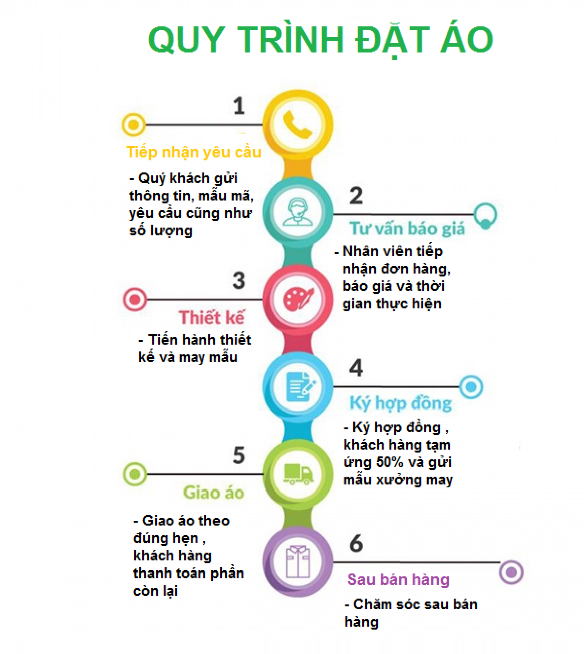 QUY TRÌNH ĐẶT MAY ÁO TẠI CÁT TƯỜNG VY Chúng tôi luôn quan tâm đến vấn đề tạo ra quy trình hợp lý nhất nhằm tối ưu nhanh và gọn nhất hiệu quả nhất có thể. Khách hàng có thể tham khảo quy trình đặt may áo tại xưởng của chúng tôi nhé